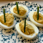 - Snij de bieslook in stukjes van 2 cm, en garneer het halve eitje hiermee