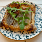 - Plaats het besmeerde bladerdeegplakje met de mascarpone naar beneden op de sjalotten