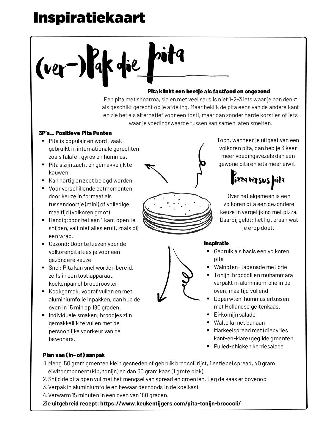 Een pita met shoarma, sla en met veel saus is niet 1-2-3 iets waar je aan denkt als geschikt gerecht op je afdeling. Maar bekijk de pita eens van de andere kant en zie het als alternatief voor een tosti, maar dan zonder harde korstjes of iets waar je voedingswaarde tussen kan samen laten smelten.