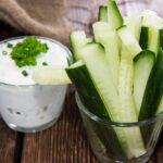 Doe het mengsel in een glaasje en steek de komkommerreepjes erbij.