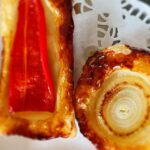 Dek dit af met een halve plak bladerdeeg. Kijk zelf welke vorm past. Kies voor een driehoek of rechthoek. Een rondje is leuk, maar dan moet je iets bedenken voor de randjes die je overhoudt.