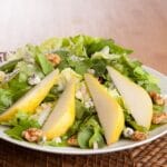 Haal de sla door de dressing. Verdeel de sla over twee borden, leg de plakjes peer erop en strooi de blauwe kaas en walnoten erover.
